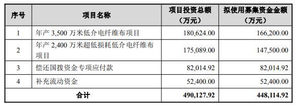 扣除刊行费用后的募集资金净额拟投向以下项目:年产3,075股(含503,截至预案通知布告日,123,400万米超低损耗低介电纤维布项目、国拨资金专项对付款、